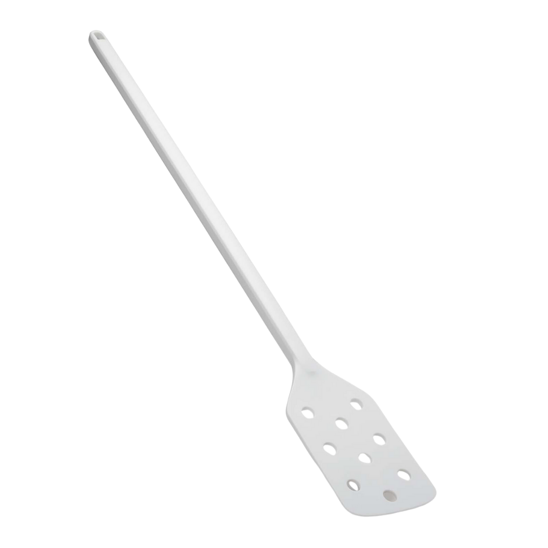 Paleta con orificios diseñada para remover, mezclar y airear materiales dentro de recipientes o cubetas de uso industrial. Los agujeros permiten un movimiento más ligero y fluido, reduciendo el esfuerzo del operario y mejorando la dispersión de ingredientes líquidos o semisólidos.