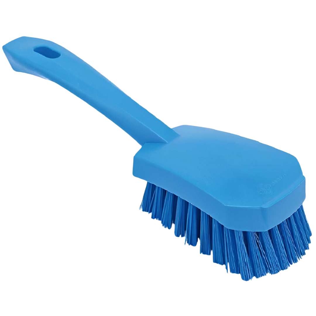 Cepillo de mano con mango corto diseñado para trabajos de limpieza exigentes en superficies industriales. Ofrece una acción firme y eficiente para remover residuos incrustados, grasa, restos de alimentos y suciedad en general.