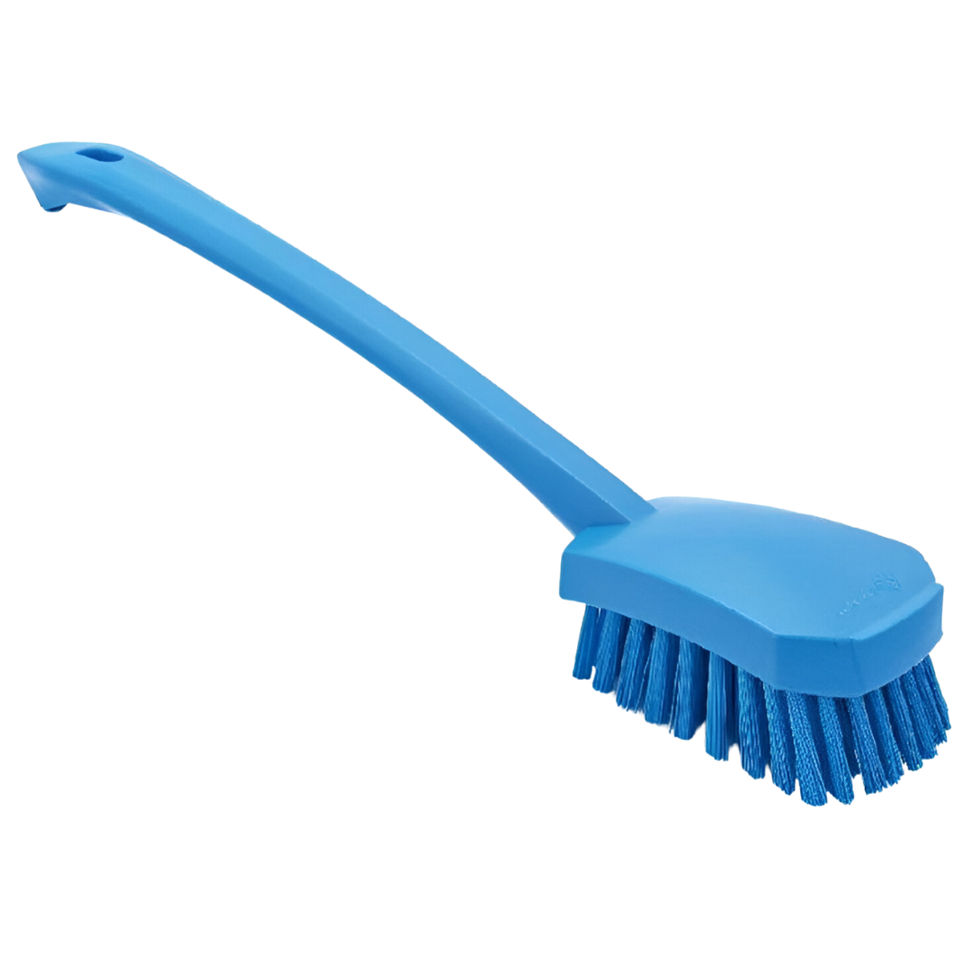 Cepillo manual diseñado con mango largo para facilitar el alcance en zonas profundas, amplias o de difícil acceso. Sus cerdas duras de PBT permiten una limpieza eficiente y firme, removiendo residuos adheridos, suciedad acumulada y restos de producción en equipos y superficies industriales.