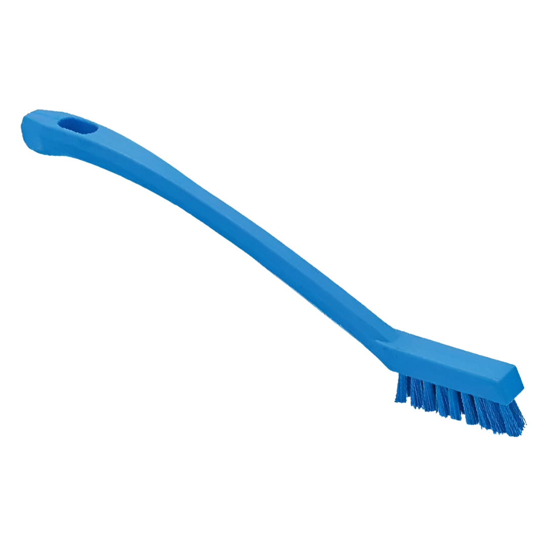 Cepillo de mano compacto con cerdas duras de PBT y cuerpo de polipropileno (PP), diseñado para tareas de limpieza minuciosa en áreas reducidas o de difícil acceso. Gracias a su mango ergonómico y ligero, ofrece un agarre cómodo y controlado durante el trabajo.