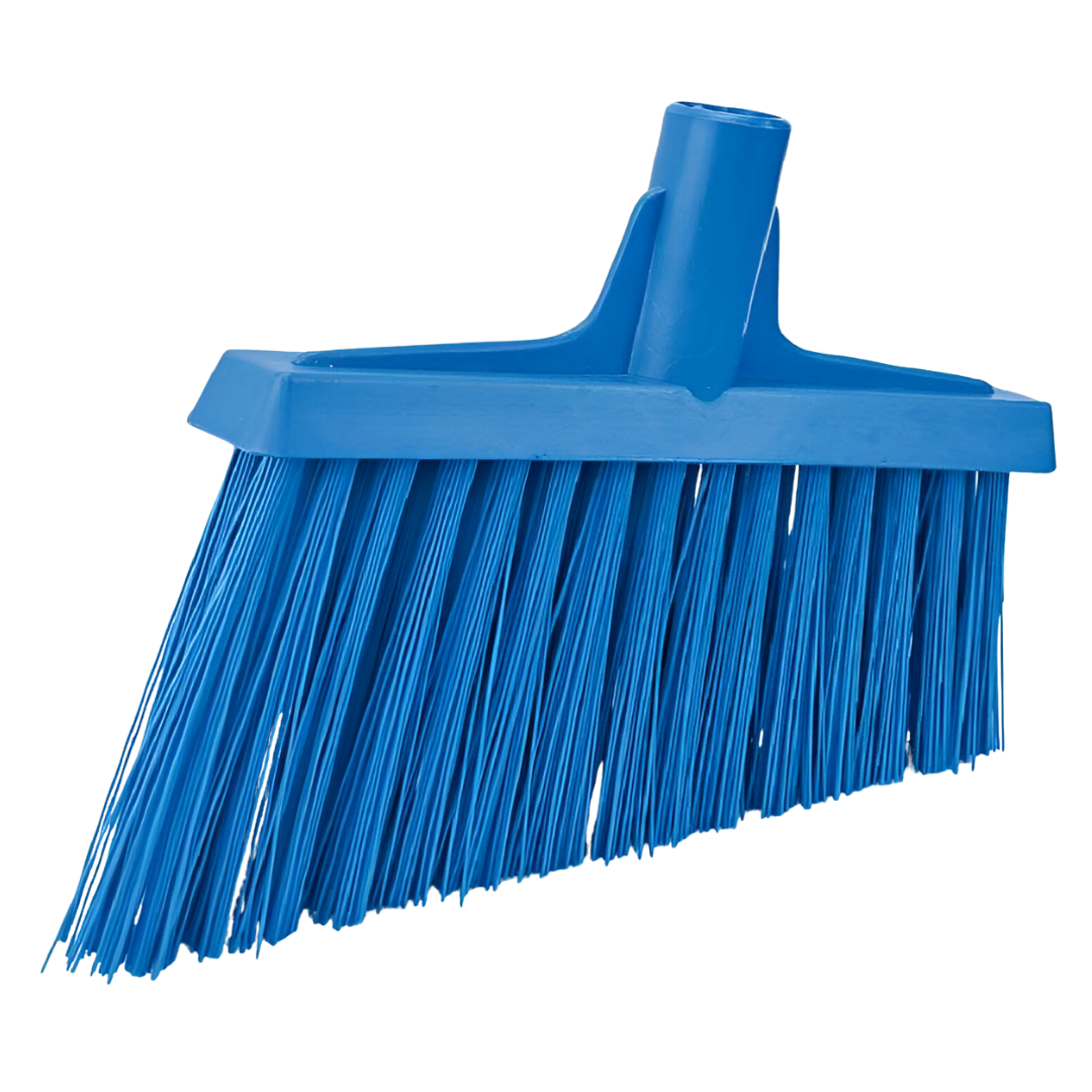 Escoba angular de 270 mm con cerdas duras, ideal para eliminar partículas grandes en superficies húmedas o secas. Resistente, higiénica y apta para uso industrial.