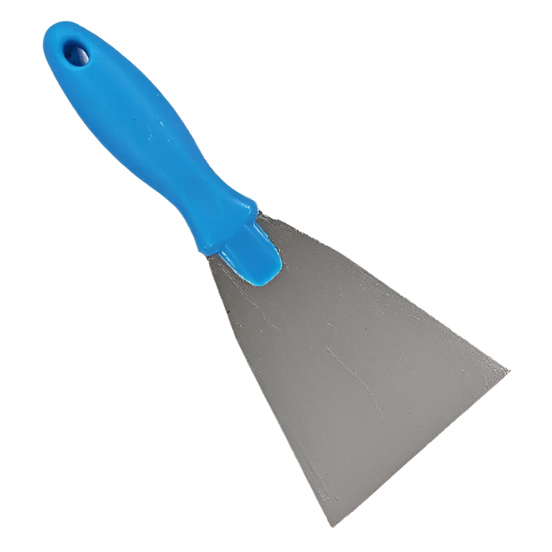 Espátula con hoja de acero inoxidable diseñada para retirar residuos pegados de forma eficiente sin dañar la superficie.